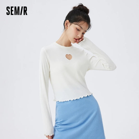Semir T Shirt Women Knitting Bottom T Shirt Comfortable Underwear Home Pajamas Love Hollow-Out Long Sleeve Top
