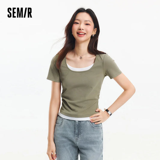 Semir Short Sleeve T-Shirt Women Cropped Fake Two-Piece Versatile 2025 New Summer Slim Fit U Neck Top Slimming for Chic Style