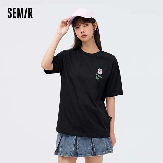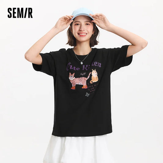Semir Short Sleeve T-Shirt Women Mid-Length Pattern Cute Retro 2025 New Summer Moisture Wicking Loose Top Niche Style