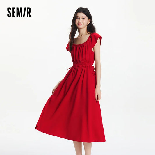 Semir Dress Women Hollow Out Waist-Cinching 2025 New Summer Flutter Sleeve Off-Shoulder Mid-Length Dress Subtle Sexy