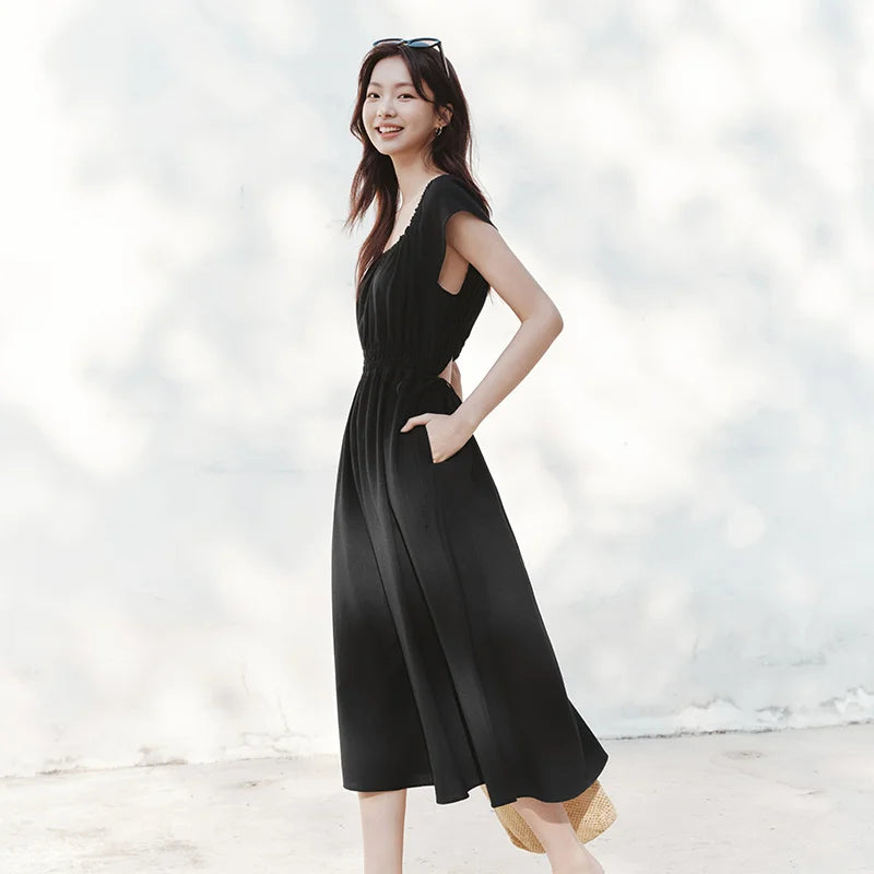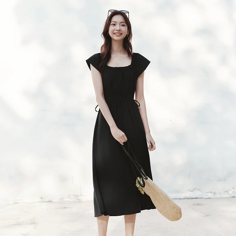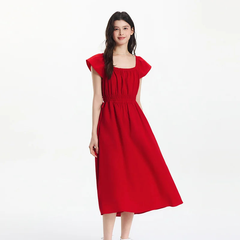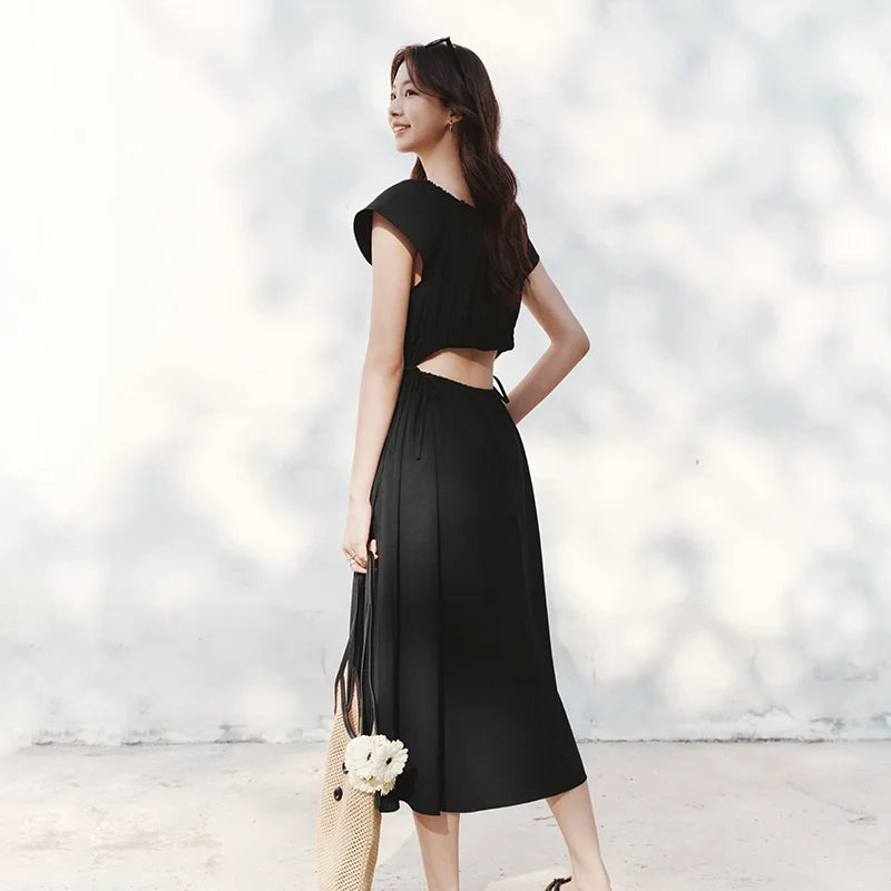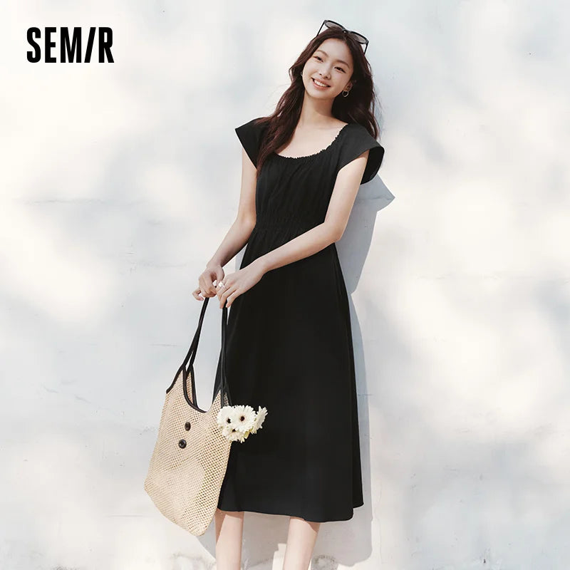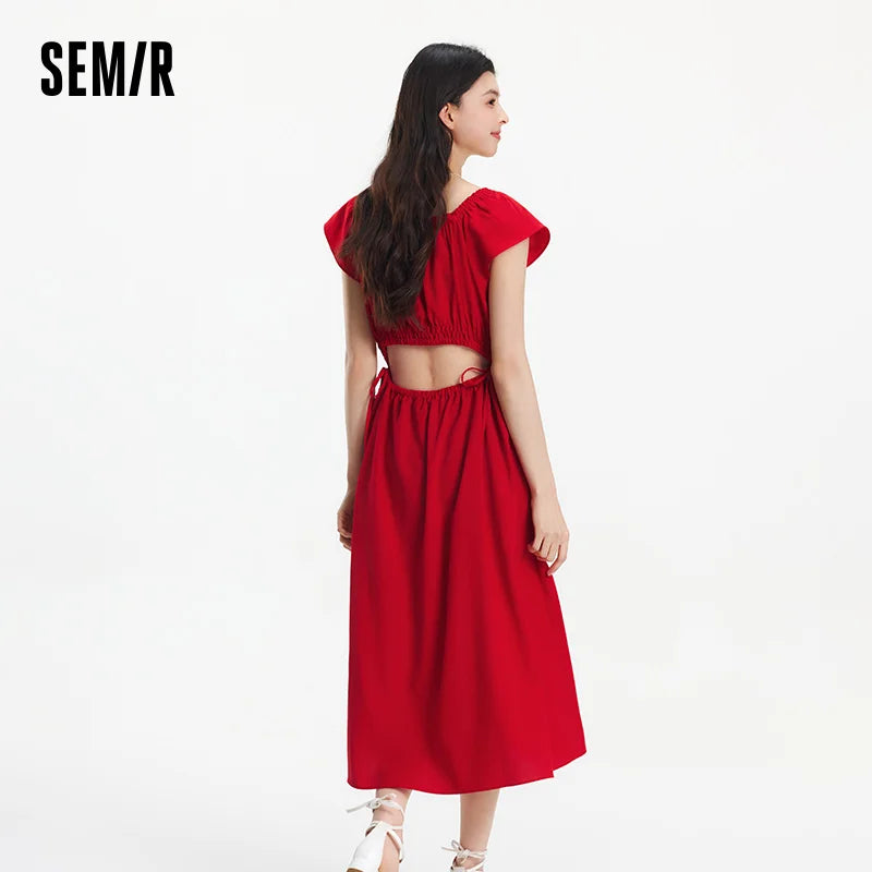 Semir Dress Women Hollow Out Waist-Cinching 2025 New Summer Flutter Sleeve Off-Shoulder Mid-Length Dress Subtle Sexy