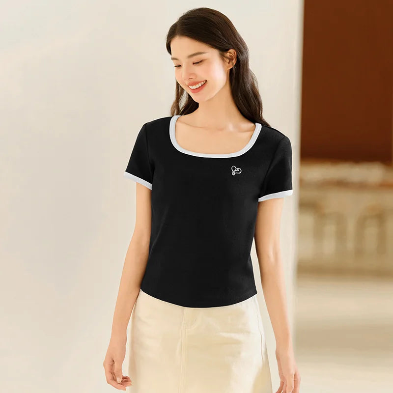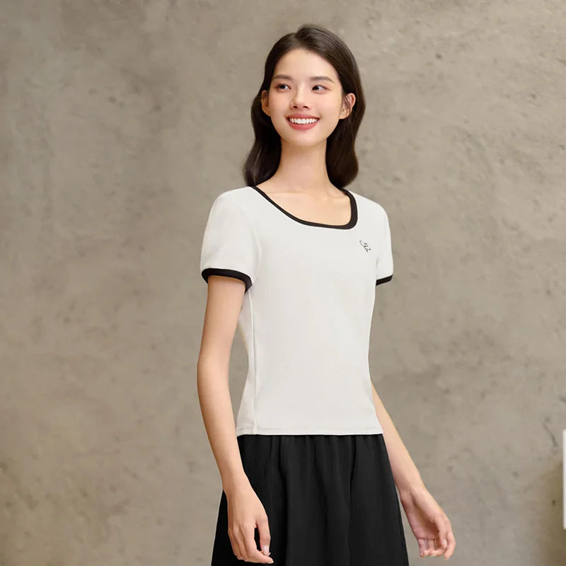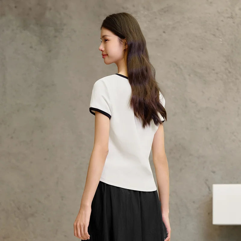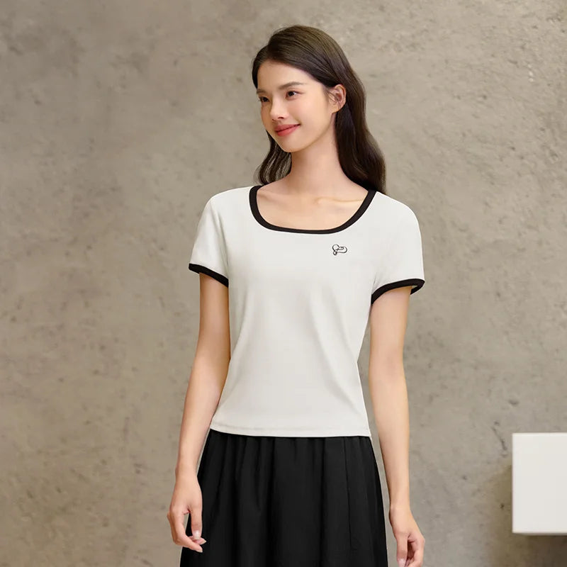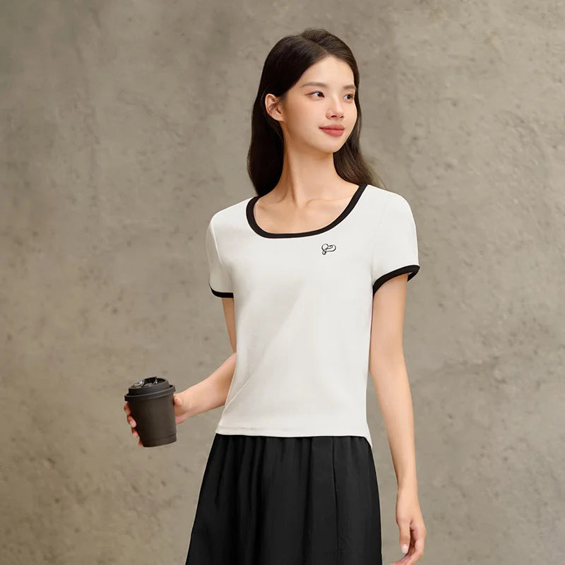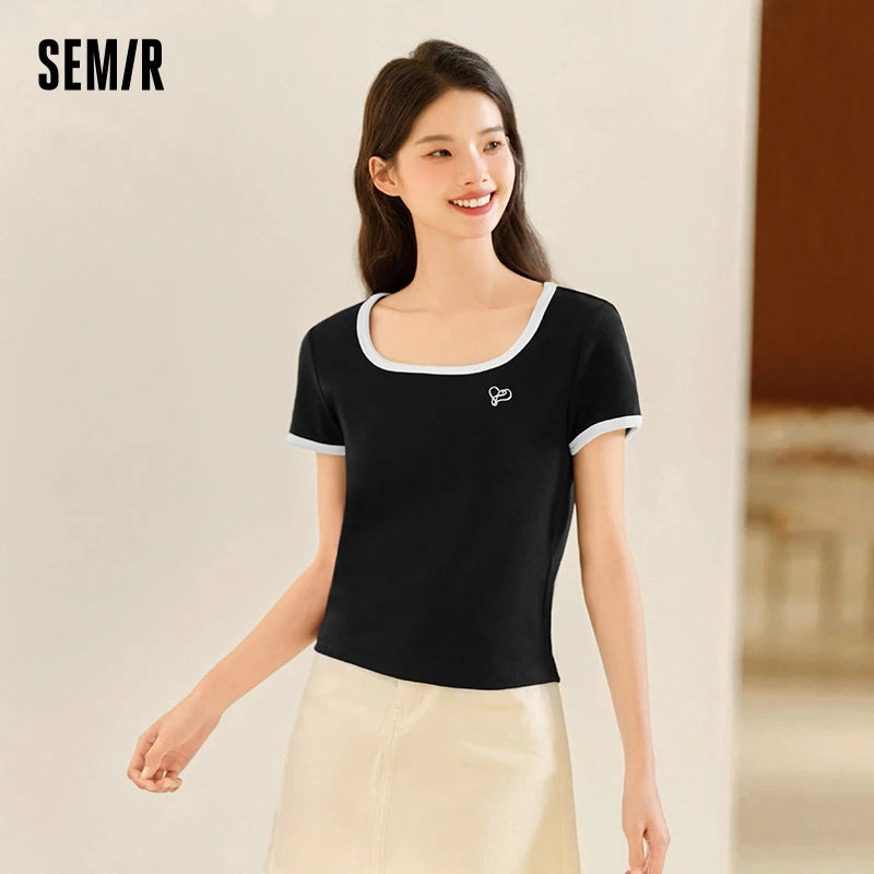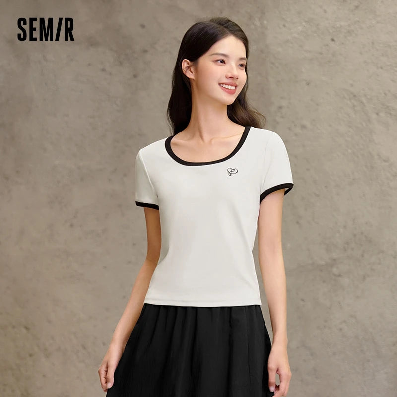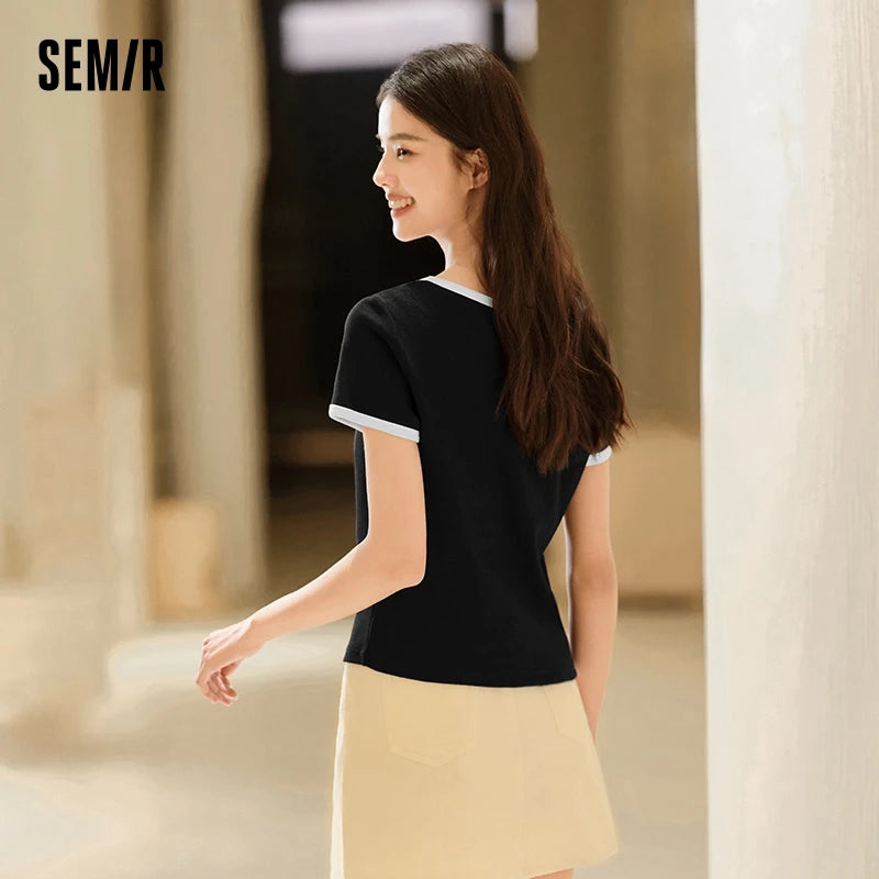 Semir Short Sleeve T-Shirt Women Short Style Small Shoulder Slightly Sexy 2024 Summer New Slim Fit Tight-Fitting Color-Block Top