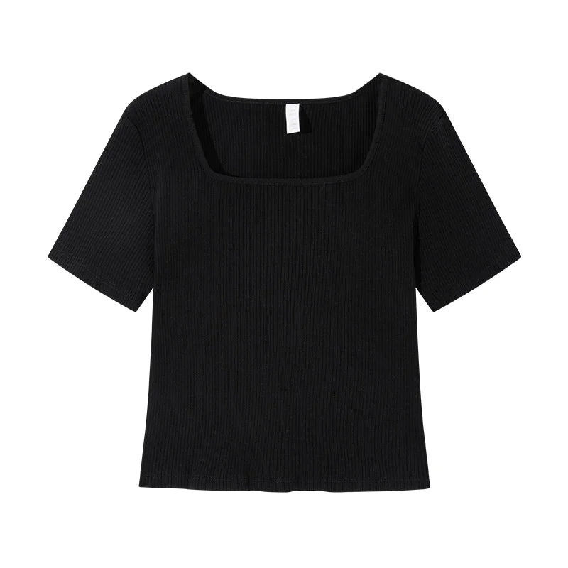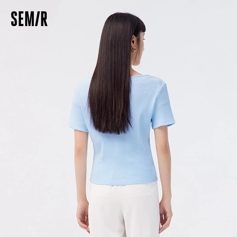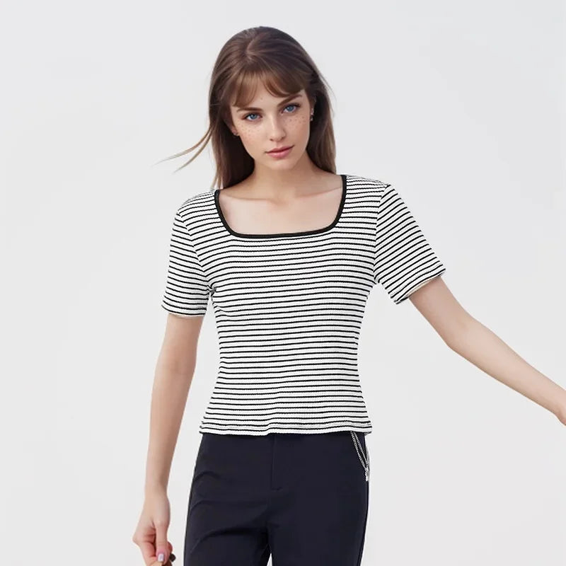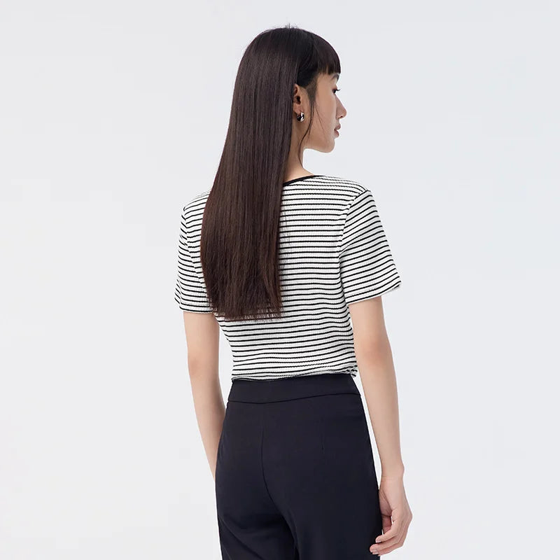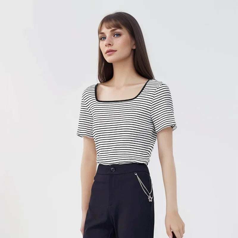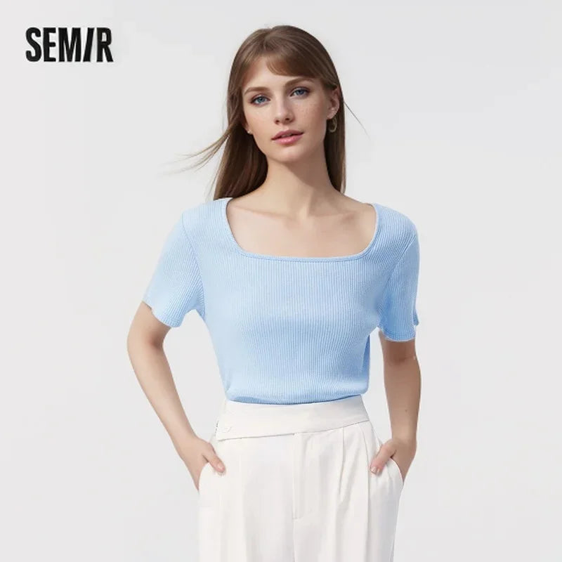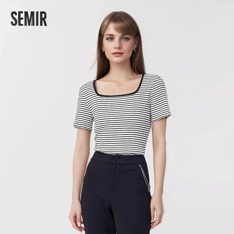 Semir Short-Sleeved T-Shirt Women 2024 Short Square Collar Summer New Tee shirts Tight Striped Shirt Temperament T-Shirt Women